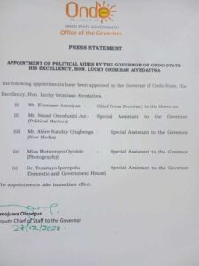 In other appointments, Governor Ayedatiwa named Smart Omodunbi his special assistant on political matters while Mr Abire Olugbenga is the special assistant on new media .