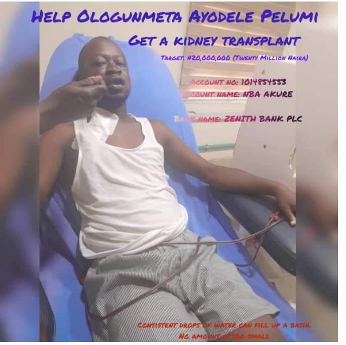 A young member of the Nigerian Bar Association, Akure Branch, Ayodele Pelumi Ologunmeta, who is battling kidney failure is pleading with well meaning individuals and entities to support him with their kind donations to enable him undergo an urgent kidney transplant.